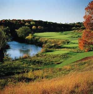 Shown here is the first hole of Blackwolf Run's River Course. This hole, named "Snake" is the only par 5 hole in the River Course's first nine holes.